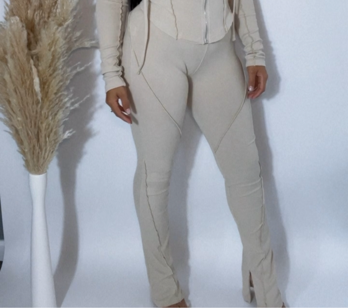 Experience our BBTM ribbed material with an extra ribbed layer for detail. We have this set in two colors (charcoal grey & creamy taupe). This set has a hooded zipper jacket, with a V shape at the waistline for detail. The bottoms are wide leg, with a zipper at the bottom to determine how wide you would like them. This set is SOLD separately.