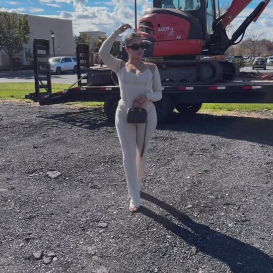 Experience our BBTM ribbed material with an extra ribbed layer for detail. We have this set in two colors (charcoal grey & creamy taupe). This set has a built in halter tie connected to top. The bottoms are wide leg, with a zipper at the bottom to determine how wide you would like them. This set is SOLD separately.