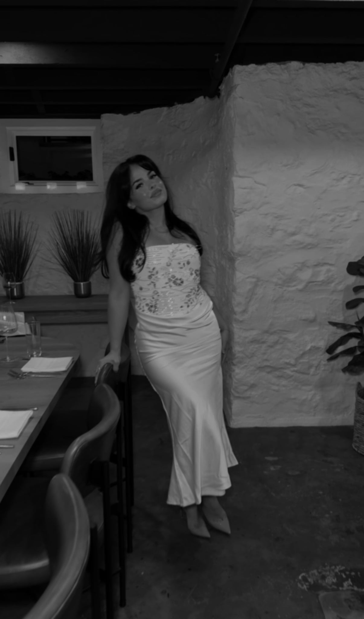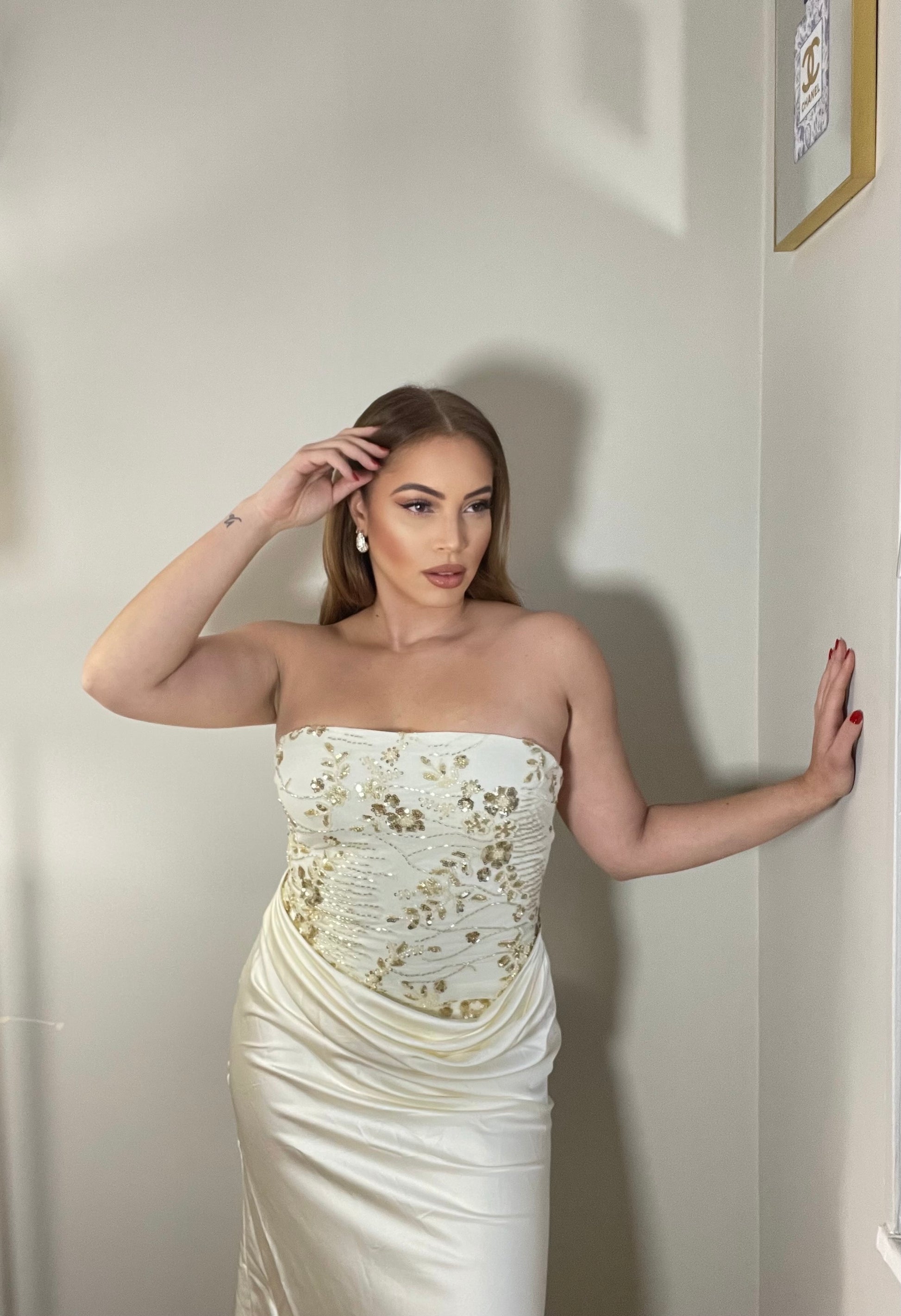 Explore the elegance and luxury of the BBTM HOLIDAY WHITE/gold satin dress. Made with high-quality satin, this dress exudes sophistication and style. With its classic white color and gold accents, it's perfect for any holiday occasion. Experience the glamour and comfort of BBTM with this stunning dress.