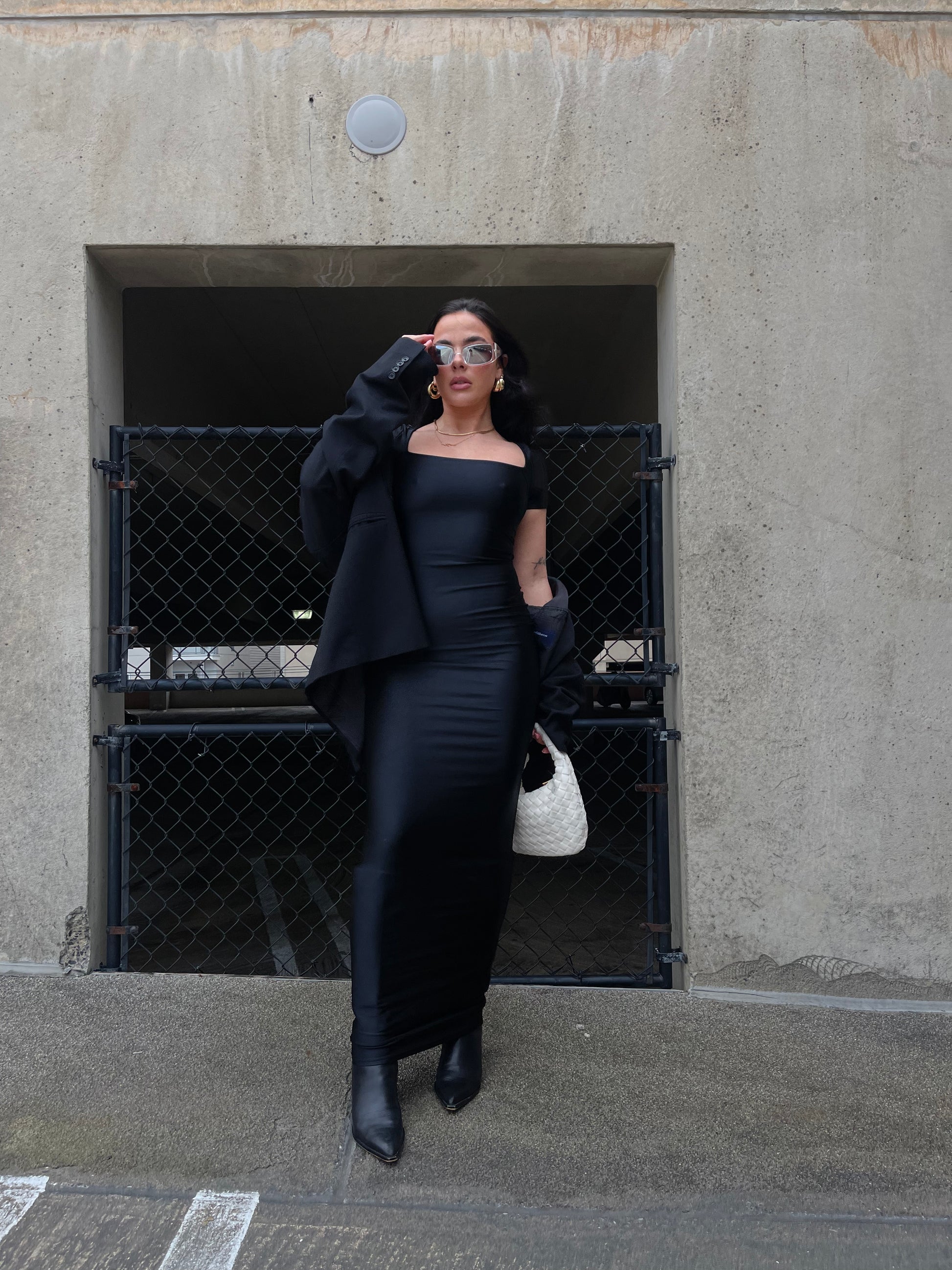 Our super spandex long maxi black dress. This dress has a square neck line, with maximum stretch to contour your body in all the right places. A simple dress every body type needs.